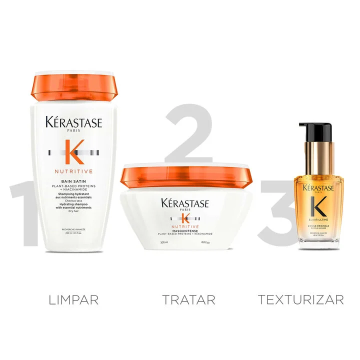 Tratamento para cabelos secos e finos que une o poder do Shampoo Nutritive Bain Satin, com ação hidratante, à Máscara Nutritive Masquintense , um tratamento ultraconcentrado para nutrição profunda dos fios. Sua fórmula ultra-delicada, enriquecida com proteínas e nutrientes essenciais, limpa suavemente, restaura a espessura natural da fibra capilar e proporciona hidratação e maciez intensa. Cabelos mais saudáveis, macios, brilhantes e com movimento natural.
