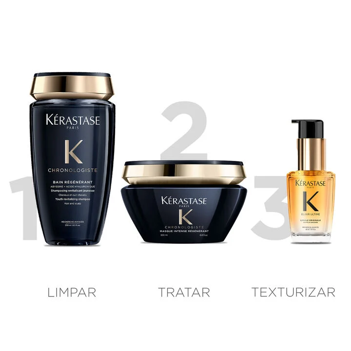 O Kit Chronologiste + Elixir Ultime contém Shampoo Kérastase Chronologiste Bain Régénérant, Máscara Kérastase Chronologiste Intense Régénérant e Óleo Kérastase Elixir Ultime L’Huile Originale.