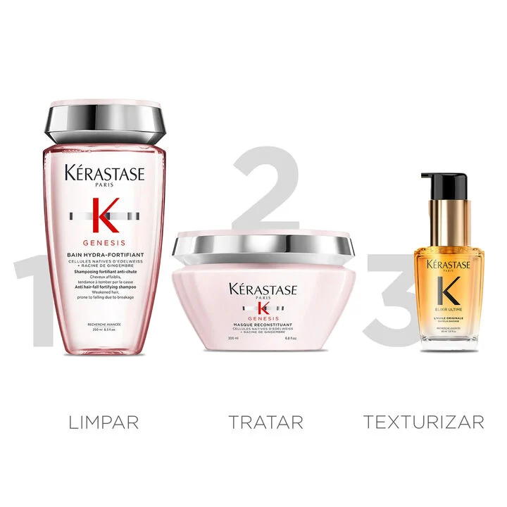 O Kit antiqueda Kérastase contém Shampoo Kérastase Genesis Bain Hydra-Fortifiant, Máscara Kérastase Genesis Reconstituant e Óleo Kérastase Elixir Ultime L’Huile Originale.