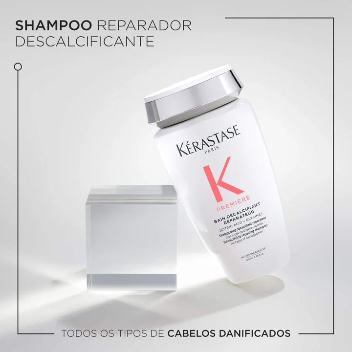 Kérastase Première Bain Décalcifiant Réparateur é um shampoo decalcificante e reparador para todos os tipos de cabelos danificados ou excessivamente processados. Este shampoo profissional sem sulfato* limpa suavemente o couro cabeludo e os fios enquanto remove o cálcio, que enfraquece ainda mais os cabelos tratados. Os cabelos são reparados de dentro para fora, com redução da quebra e restauração da saúde.