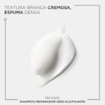Com uma textura cremosa branca que se transforma em uma espuma luxuosa, sua ação dupla combate o excesso de cálcio da água dura que ataca cabelos já danificados ou descoloridos, deixando-os opacos, sem vida e pesados. Além disso, restaura os elos de queratina dentro da fibra capilar, reparando os fios desde o núcleo. O cabelo fica suave, fácil de manejar, brilhante e cheio de movimento.